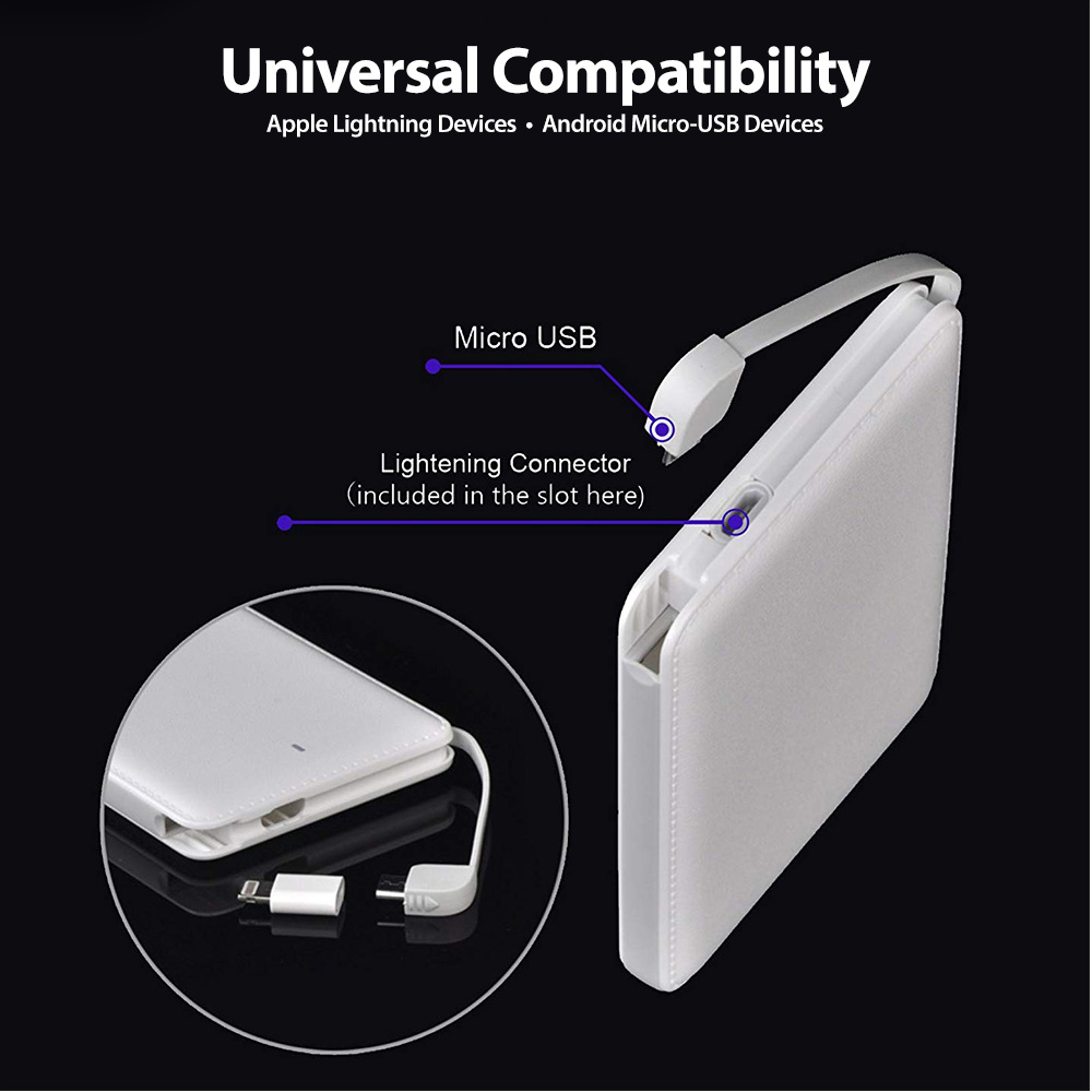 A Portable Battery Charger with a Built-in Micro Cable & Lightning Connector for Android Micro USB and Apple Products